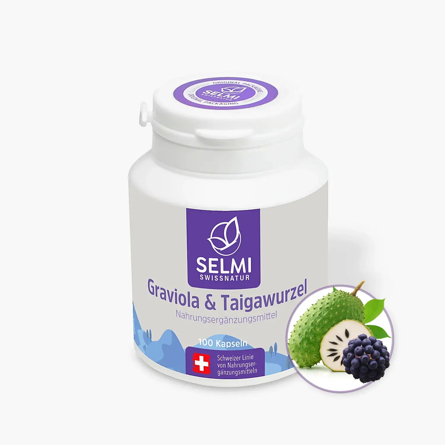 Graviola & Taigawurzel von Selmi Swiss ist ein natürliches Nahrungsergänzungsmittel, das die Eigenschaften von Graviola und Taigawurzel kombiniert, Pflanzen, die für ihre gesundheitlichen Vorteile bekannt sind. Dieses Produkt wurde entwickelt, um das Immunsystem zu unterstützen, die Energie zu steigern und das allgemeine Wohlbefinden zu fördern.