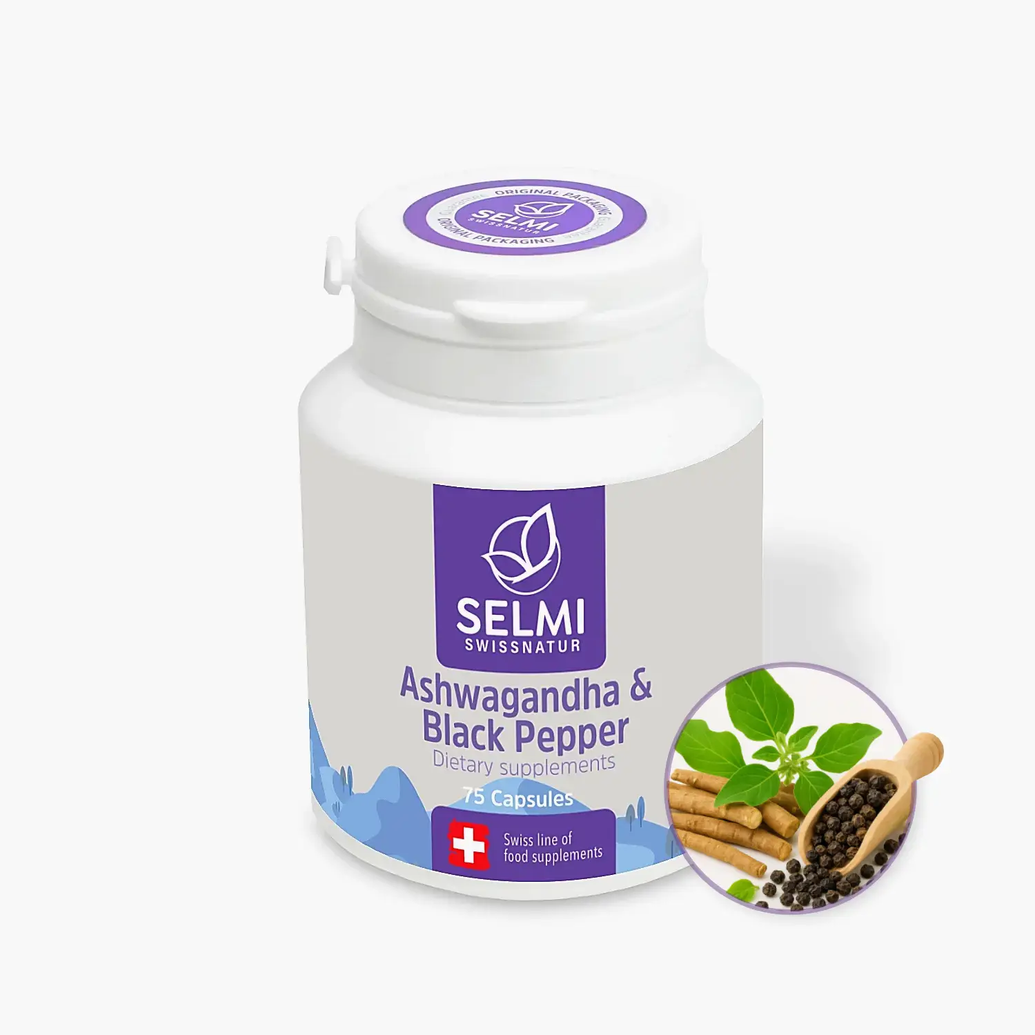 The Ashwagandha and Black Pepper from Selmi Swiss is a supplement designed to manage stress and anxiety, increase energy and vitality, and improve cognitive function and memory. Each capsule combines ashwagandha powder and black pepper extract to enhance its benefits.